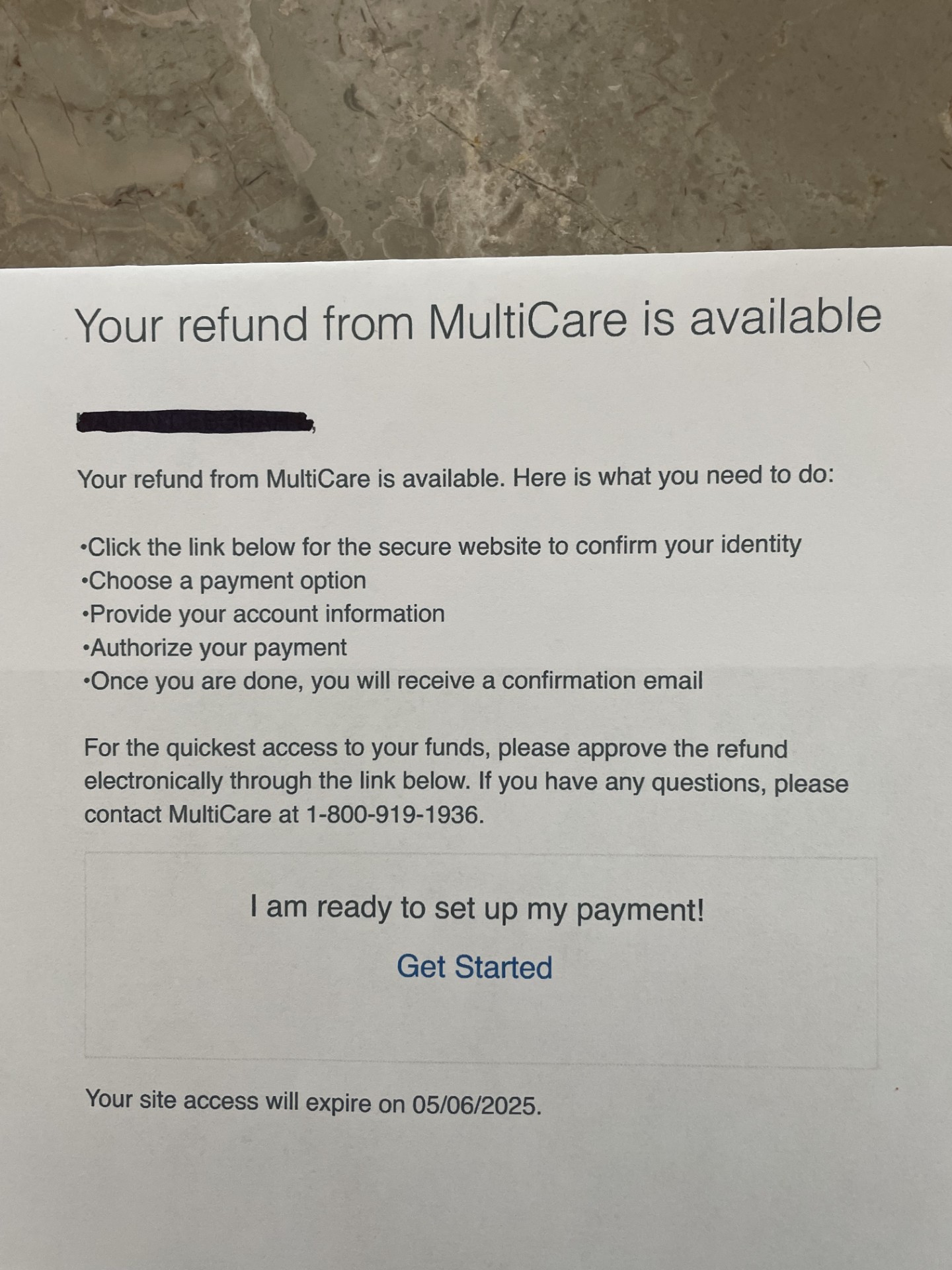Titled “Your refund from Multicare is Available”. Do not respond. No refund.